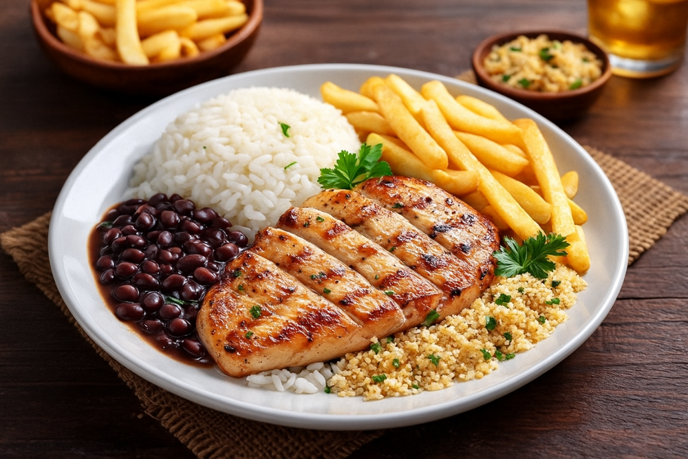Filé de peito de frango grelhado, servido com arroz, feijão e farofa. Opção mais leve sem perder o sabor.