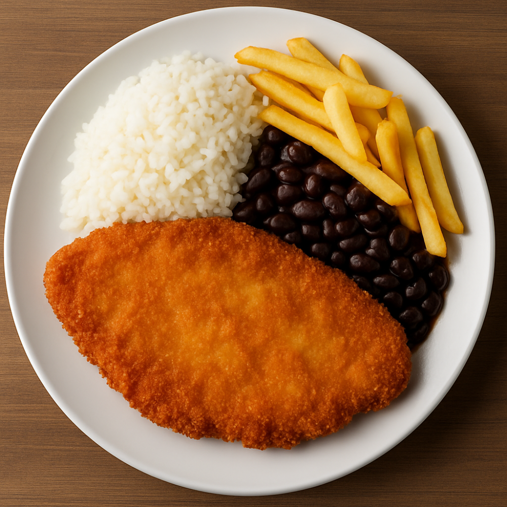 Filé de frango empanado crocante, acompanhado de arroz, feijão e farofa. Perfeito para quem gosta de frango sequinho.