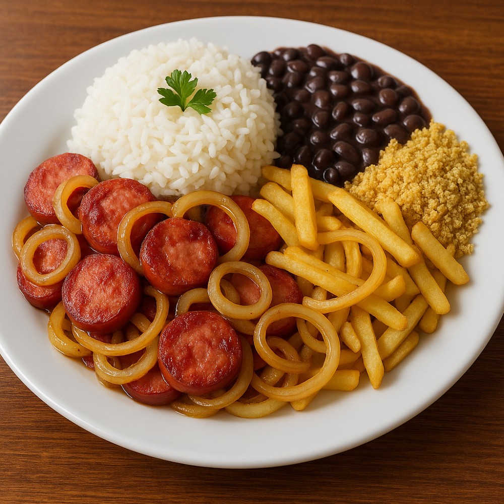 Linguiça calabresa acebolada, servida com arroz, feijão e farofa. Prato bem temperado e cheio de sabor.